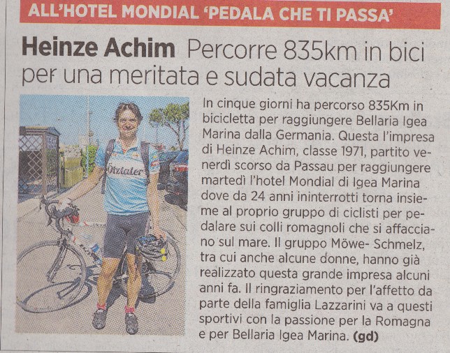 In 5 Tagen (so lange habe ich dann doch nicht gebraucht - der Verf.) hat er 835 km auf dem Rad zurückgelegt, um Igea Marina Bellaria von Passau aus zu erreichen. Für dieses Unternehmen von Achim Heinze, Jahrgang 1971 (das stimmt leider - der Verf.) ist er vergangenen Freitag in Passau aufgebrochen, um am Dienstag (Montag war´s - der Verf.) das Hotel Mondial in Igea Marina zu erreichen, wo seit inzwischen 24 Jahren geeignete Radgruppen zusammentreffen um in den Hügeln der Romagna zu pedalieren, die auf das Meer hinunter schauen. (...sich über dem Meer erheben... gefiele mir besser, aber das dürfte manchen schon wieder zu frei übersetzt sein- der Verf.)