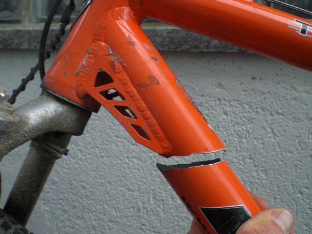 Auch einen besonderen Moment, der zum Glück nur im Gedächtnis, und nirgendwo anders am Körper eingraviert ist, zeigt folgendes Bild: Der Rahmenbruch ist natürlich in voller Fahrt passiert, es kam aber nicht zum Sturz. Bin übrigens nach Bandage mit vielen Heftpflastern (etwas anderes war unterwegs nicht aufzutreiben) noch 45 km zurück gefahren, allerdings nur mit maximal 20 km/h und auf Teerstraßen.