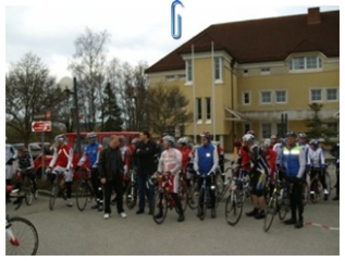 Wie immer nach dem Start forciert Thomeas Stindl das Tempo. 20 Teilnehmer lassen sich nicht davon entmutigen und bleiben tapfer dran. Ich fahre einfach mit, muss aber immer etwas Platz zum Vordermann lassen. Warum? Weil sich an meinem Rad ein Flaschenhalter gelockert hat und ich den Kanaldeckeln und Fahrbahnschäden des harten Winters ausweichen muss, um das Getränk nicht zu verlieren.