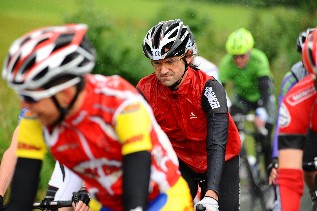 Auf Sicherheit hielt ich mich meist am Ende des ca 40 Fahrer starken Pelotons auf, um immer wieder Löcher zuzufahren. Sowohl Phyrnpass als auch Hengstpass wurden auf diese Art passiert. Auf dem Weg Richtung Gesäuse geschah es dann doch, dass eine vierzehn Mann Gruppe wegfuhr. Bis wir am Ende reagieren konnten, war die Lücke zu groß. Zusammen mit Walter Lehki versuchten wir, nur zu zweit die große Lücke im Sprint zu schließen, was nur ihm gelang. Ich hingegen fuhr eine Zeit allein, bis drei Fahrer und bald die zweite Gruppe nachkamen. Ich probierte es mit wechselnden Radpartner, auch allein, bis endlich 2 wackere Mitstreiter gefunden waren, um die Lücke kurz vor der Kaiserau zu schließen.