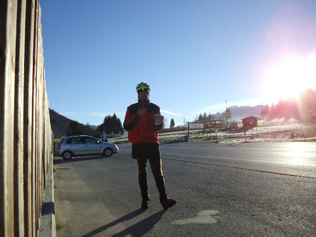 Da nichts anderes übrig blieb, habe ich notgedrungen das eisige Getränk geschluckt und auf mehr Wärme gehofft, sobald das Gebirge hinter mir liegen würde. Einzige wärmende idee war mein Capri Sonne-Trick: An Tag 2 startete ich mit je einer der genannten Tüten in den hinteren Trikottaschen, sodass ich mich unterwegs zweimal an angenehm warmen Getränken erfreuen konnte. Not macht eben erfinderisch! (Falls dies jemand nachmachen möchte: Funktioniert nicht mit eckigen Sunkist-Tüten und - ganz wichtig - Safttüten vor dem Einstecken ins Trikot anwärmen, sonst geht´s direkt an die Nieren!)...