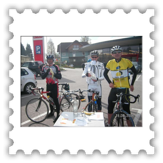 Doch: Kaum war ich aus dem Auto ausgestiegen, weckte mich die Ankündung von Thomas Stindl, "dass heute vom Start weg attackiert wird," endgültig auf. So war`s dann auch. Nach einem Kilometer Schonfrist bzw. Warmfahren, beschleunigte T.T. auf knapp 50 km/h. Neun weitere Fahrer gingen mit, - im Gegensatz zum Vorjahr hatte ich aufgepasst und war dabei. Bis zur 1. Kontrollstelle waren wir nur noch 4 Fahrer: Thomas Stindl und sein Vereinskamerad Harald Reinbacher, Manuel Jung und ich. Landschaftlicher und leistungsbezogener Höhepunkt war die Großalmstraße zwischen Traunsee und Attersee bei Gegenwind. Sinn hätte ein Angriff nur hier gemacht, aber eine Alleinfahrt wäre wenig Erfolg versprechend gewesen und bei einem viertelherzigen Versuch meinerseits ging niemand mit. Einziger Ertrag war der Hinweis, dass es 3:1 gegen Deutschland (für Österreich) steht.