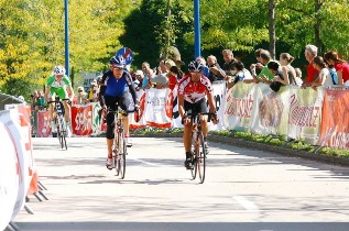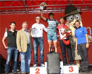 Reduziert wird das Feld erst am 14%-Anstieg, ca. 30 km vor dem Ziel. Zu zehnt arbeiten wir uns mit unterschiedlichen Anteilen gen Ziel voran. Unsere zeitweise Uneinigkeit nutzt der Langstreckenfahrer und Lokalmatador Christian Gammer, der 15 km vor dem Ziel entflieht. Somit sprinten neun Verbliebene um die Plätze 8 bis 16. Als Sprintzweiter schaffe ich es auf Rang 9, in der Ak auf Rang 3 hinter Paul Lindner und Günter Baringer.