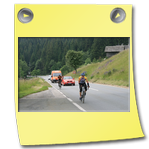 Als ich vor Huben kurz anhielt, schoss "der Kölner" samt Wohnmobil vorbei. (Ich wusste von den verteilten Spitznamen seitens meines Begleitteams nichts und wunderte mich immer, wenn sie vom Memminger oder dem, mit den langen Haaren sprachen. Lustigerweise hatte der vermeintliche Bombenleger nur ein Tuch umgebunden! Von all den Gerüchten, wer wo liegt, wer bereits aufgegeben hat, bekam ich wenig mit.) Die Solofahrt ging weiter über Felbertauern (ohne Regen!), Mittersill (sehr ruhig!) und Zell am See (die ersten volltrunkenen Zuschauer!!) zur Großglockner Hochalpenstraße. Um 5.00 morgens organisierte Chris bei der Auffahrt zum Glockner 1 Packung Kamillentee, indem er in Hausdurchsuchungsmanier in eine Ferienwohnung "eindrang". Sein diplomatisches Geschick half ihm ohne dienstliche Konsequenzen (und mir) auch aus dieser Situation.