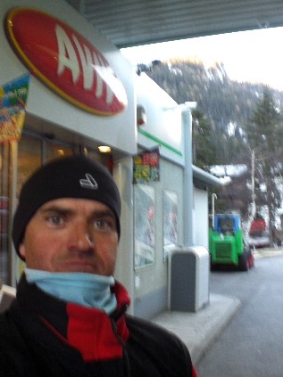 Damit kann ich noch bei Winterzeit (um halb 7 dunkel !) den Brenner in Angriff nehmen. Leider schon komplett im Schatten, denn mittlerweile ist das Wetter sonnig geworden, nur das Tal zum Brenner hinauf hat um diese Jahreszeit noch nichts davon!! In der Tanke am Pass (Foto 2) meint die Angestellte, dass ich dieses Jahr der erste Radfahrer bin, der drüber fährt (über den Pass).