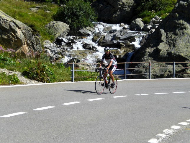 In der Abfahrt von Oberalbpass erlitt mein Rad einen Defekt, was dazu führte, dass ich für den Rest des Rennens, also noch ca. zwei Drittel, die Gänge 7,8,9, und 10 nicht mehr benutzen konnte. So hieß es bergab nur noch rollen. Zu allem Überfluss geriet ich bergab in der Schöllenenschlucht direkt hinter einen Schwertransport, der nur 25 bis 30 km/h fuhr und nicht überholt werden konnte. Wenigstens gab es großes Lob vom dort postierten Streckenposten. Doch: Die Zeit ist einfach weg. Da es jedoch bergauf immer noch perfekt lief, war ich am Sustenpass weiter bis auf Position 5 vorgerückt. Ähnlich locker lief es auch den Brünigpass hinauf und selbst der steile und der direkten Sonnenstrahlung ausgesetzte Glaubenberg forderten mich nicht voll. Dafür die Abfahrt um so mehr: Auf halber Höhe war die Straße wegen eines Baukrans komplett gesperrt. Also beratschlagen, was zu tun sei. Die Rennleitung anrufen? Ich fuhr schließlich dementsprechend verunsichert und ohne navigierendes Begleitfahrzeug weiter. Mittlerweile auf Rang vier, war das Rennen damit irgendwie vorbei. Wie sollte ich ohne Begleitfahrzeug den Weg auf der vorletzten Etappe finden? Ich rollte langsam bergab und blieb auch mal stehen, um das Handy einzuschalten.