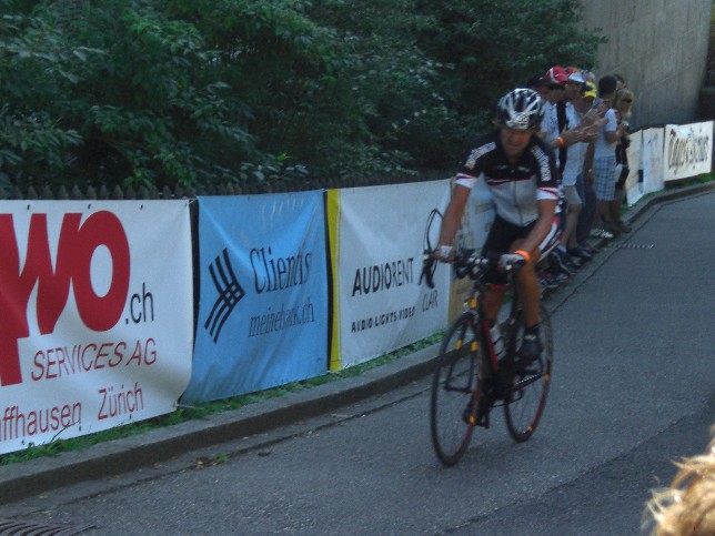 Unser Prestart war am Donnerstagmorgen um halb fünf (ich schreibe es deshalb, weil die nächste "Mütze" Schlaf erst 44 Stunden später zu haben sein würde). An diesem Donnerstag musste man sich für weiter angereiste Teilnehmer zeitig im Startort Schaffhausen einfinden, um die Startunterlagen abzuholen. Danach hieß es wieder nutzlos herumsitzen bis zur Rennbesprechung. Um 15:45 war dann Prologstart: 600 Meter flach und danach ca. 100 Hm, gesamt nur 1 km. Die Startreihenfolge war eigentlich vorgegeben, wurde aber von manchen bereits aus taktischen Gründen verändert. Mich erwischte es leider so, dass ich als erster von vier Teilnehmern fahren musste. Der vorausfahrende Motorradfahrer bremste im Flachen, ich musste dasselbe tun und die Sache war schon gelaufen. Damit wäre eigentlich der erste Ärger vorprogrammiert, aber ich schaltete auf Egalmodus und fuhr statt mit dem Bus im dichten Stadtverkehr zur Spagettispeisung lieber an den wie immer sehr angenehm temperierten Rhein zum Schwimmen. Wir gingen noch essen und sprachen kaum noch über das Rennen, sondern hatten genug andere Themen.