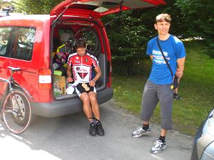 Jetzt, während der neutralisierten Phase von 22 km, ist aber ein sonniger, 30° heißer Sommertag - perfektes Radwetter! Einige interessierte Radsportler, wie Hans Wünscher, begleiten uns zu Beginn. Am Waldschacher See wird kurz angehalten - die letzte Gelegenheit bis Winklern (um 22:00 Uhr !) für die Blase, zu ihrem Recht zu kommen.