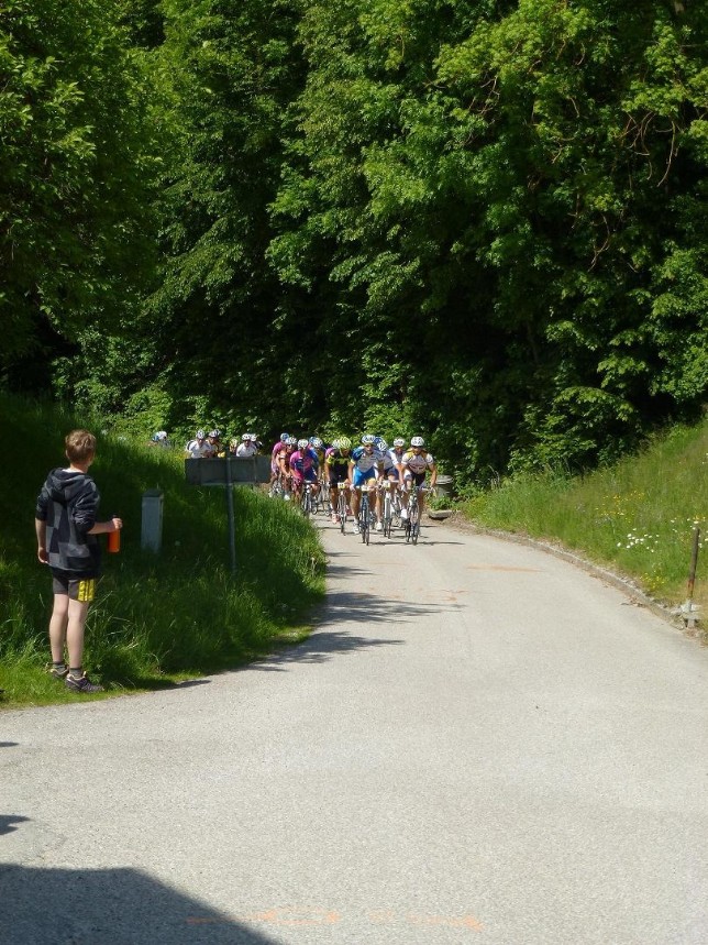 Ich verliere den Anschluss an die erste Gruppe, als Trost gibt´s wenigstens eine ungestörte Übergabe der Flasche am Ende des zerrissenen Hauptfeldes. Nachdem sich alles neu sortiert hat, bilde ich mit Robert Mayr, Christian Gammer, Robert Buchleitner und Walter Sageder eine gut funktioniertende Gruppe. Mit unserem zügigen, aber gleichmäßigen Tempo macht Radfahren gleich wieder richtige Freude! Von 6 Minuten Rückstand auf die bereits zuvor davon geschlichene Fluchtgruppe arbeiten wir und bis auf 2 Minuten wieder an die Spitze heran. Ein paar Versprengte werden dabei eingesammelt bzw. überholt.